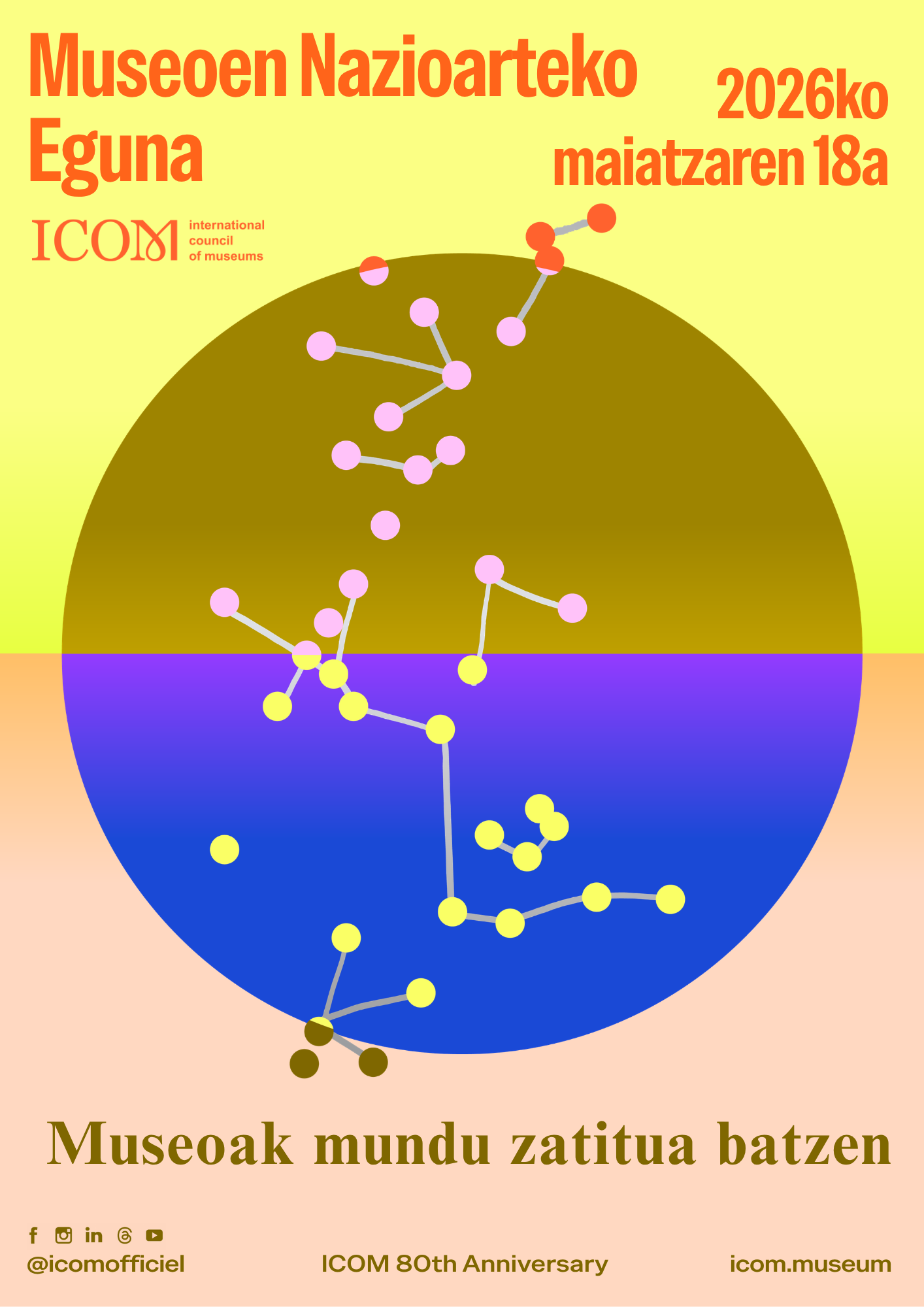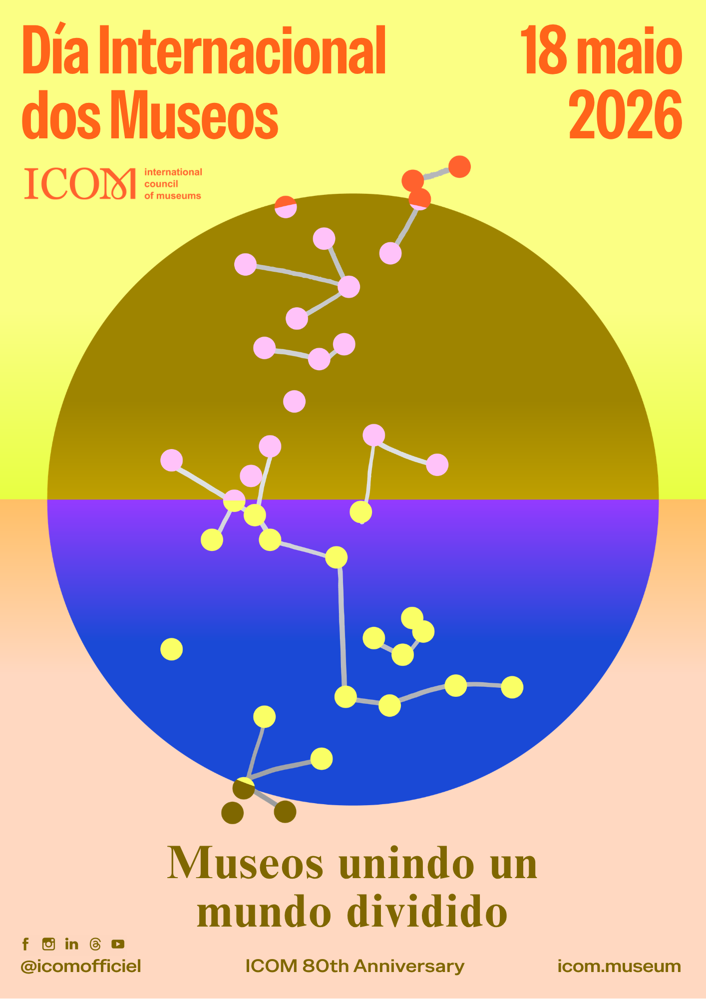 En 2026, este tema marcará también las celebraciones del 80.º aniversario del ICOM, que conmemora ocho décadas de dedicación al apoyo de los museos y los profesionales de todo el mundo. Este hito ofrece la oportunidad de reflexionar sobre el compromiso duradero del ICOM con el fomento de una comunidad museística mundial sólida y conectada, así como con la promoción del papel social fundamental de los museos en un mundo en constante evolución.